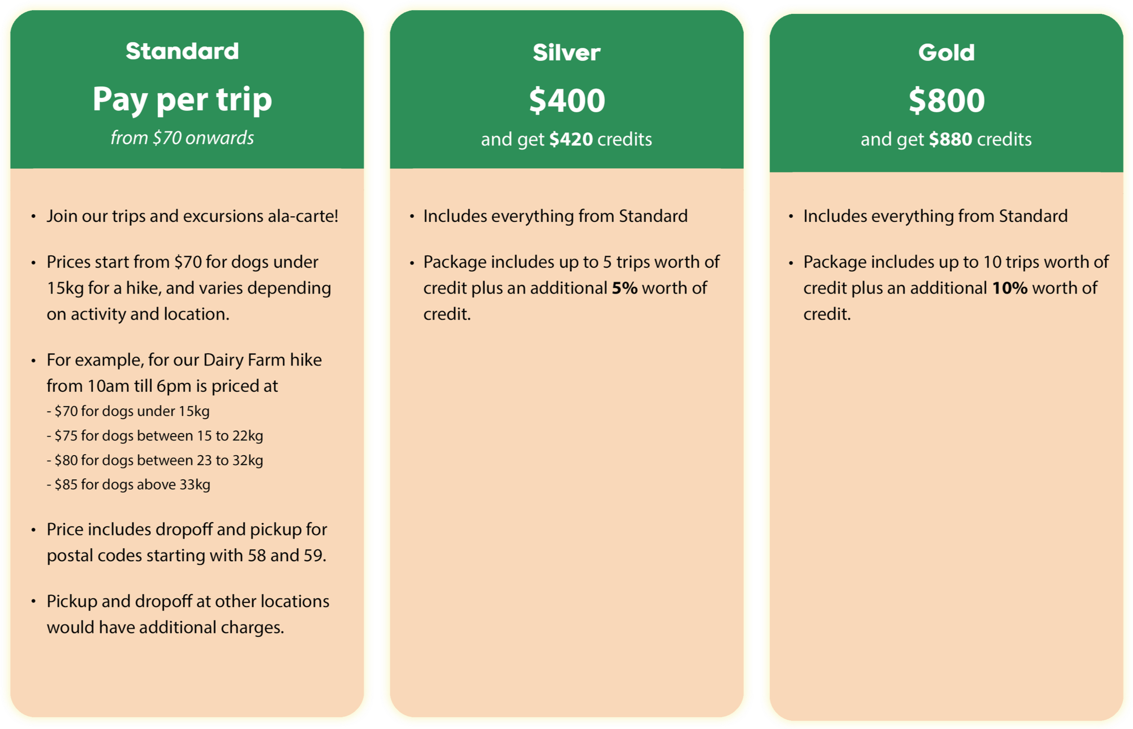 Dogs will be picked up from your house for a pre-trip social to get to know each other. Then they will be brought on the trip you signed up for such as off-trail hikes in the forest, or to other islands around Singapore and given the freedom to explore with minimal supervision. They will be allowed off lead within sight and within safe parameters. At the end of the trip, they will be dropped back to your home tired, stronger, relaxed and happy.
